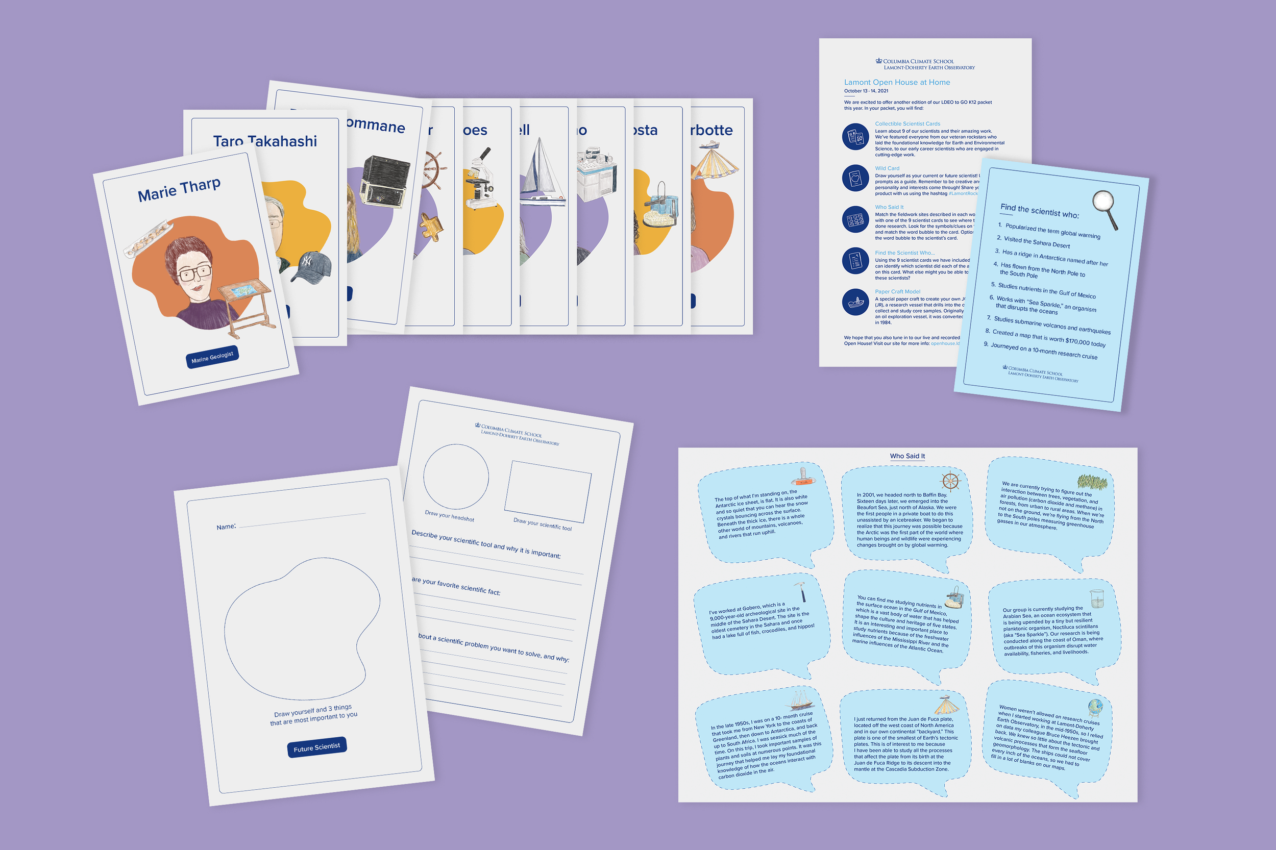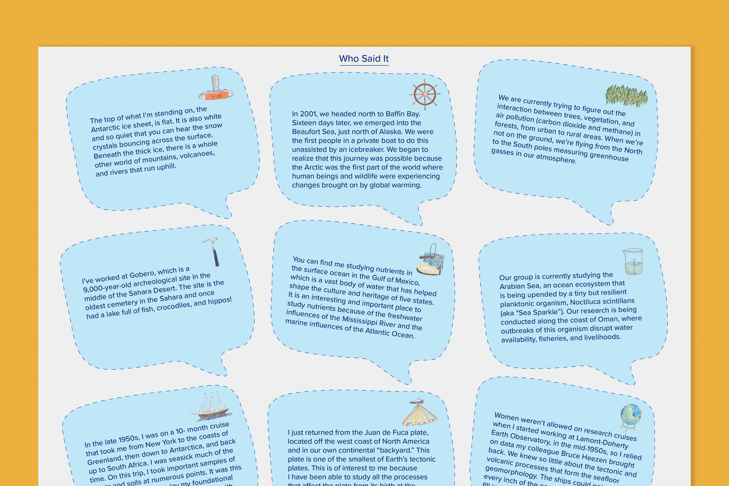 A set of collectable cards and activities were included in this kit. One of the activities included a worksheet, where one would match the fieldwork site described in each word bubble with one of the scientists. A trivia card and a wild card for filling out their very own collectable card was also included.